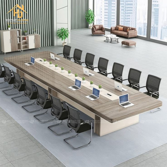 Bàn trong phòng họp thường được thiết kế hình chữ nhật dài hoặc hình oval để tiết kiệm diện tích. Các ghế tại phòng sẽ có màu sắc cùng kiểu dáng giống nhau để tạo sự thống nhất trong không gian.