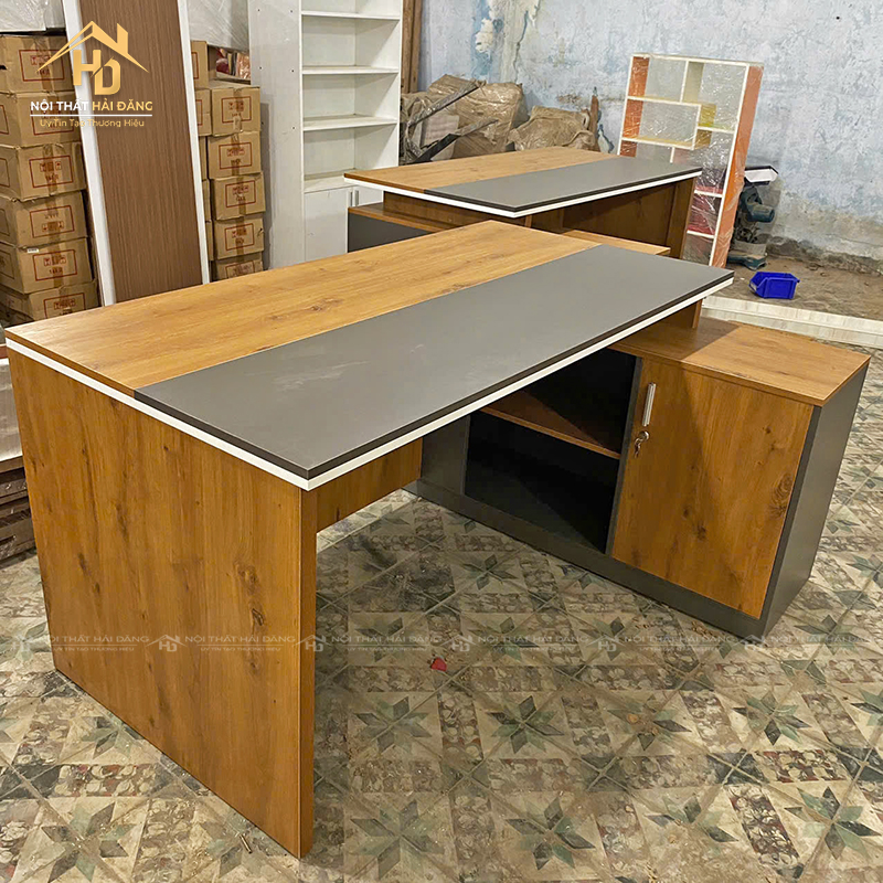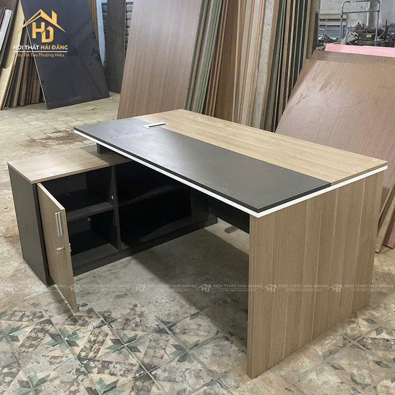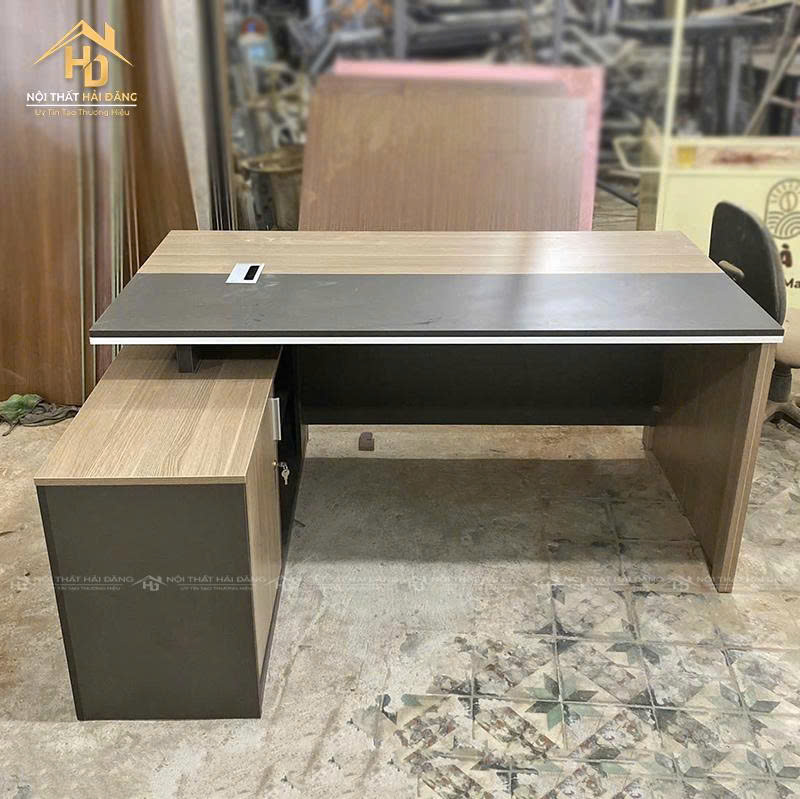 Bàn giám đốc gỗ công nghiệp là lựa chọn hợp lý cho không gian văn phòng hiện đại. Sản phẩm có mặt bàn rộng rãi, phối màu nâu gỗ sang trọng với phần đen nhấn mạnh cá tính. Bên hông có tủ phụ đi kèm giúp bạn dễ dàng cất giữ hồ sơ, vật dụng cá nhân hoặc thiết bị văn phòng. Chất liệu chống trầy, dễ lau chùi, bền chắc theo thời gian. Bàn được thiết kế dạng chân hộp, đảm bảo vững chãi khi sử dụng lâu dài. Đây là mẫu bàn phù hợp cho giám đốc, trưởng phòng hoặc nơi làm việc tại nhà khu vực tiếp khách chuyên nghiệp.