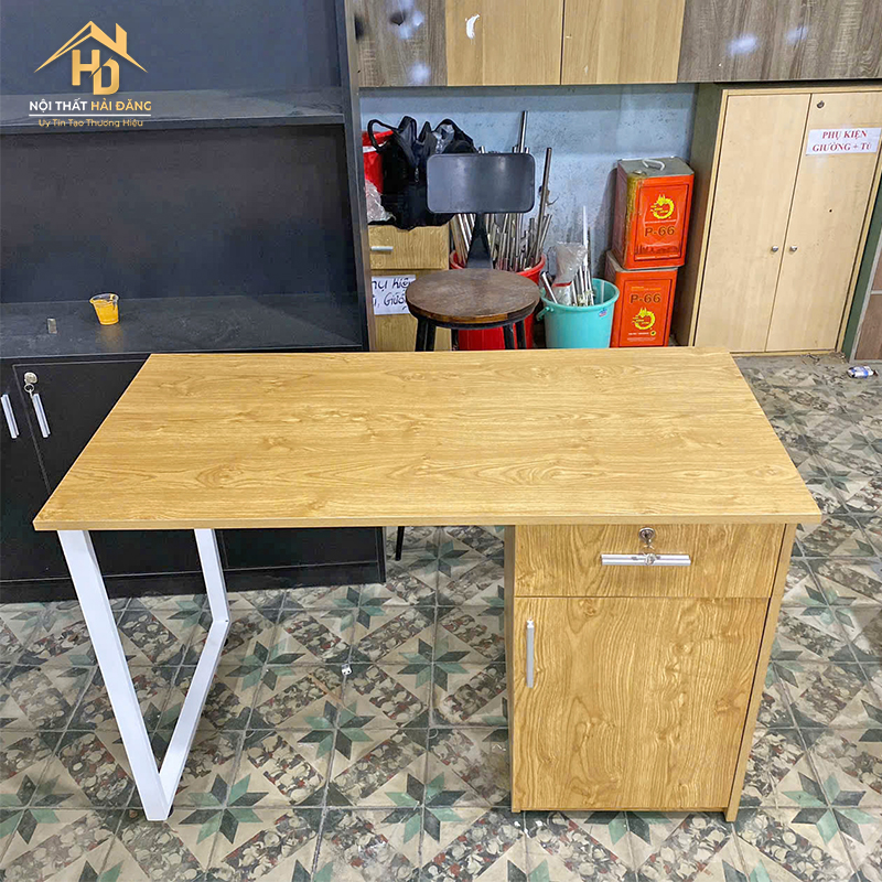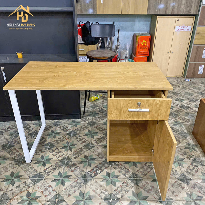 Sản phẩm là mẫu bàn phổ thông được ưa chuộng nhờ thiết kế gọn gàng, dễ sử dụng. Phần mặt bàn rộng rãi, màu vân gỗ sáng tạo cảm giác mát mắt, sạch sẽ. Bàn có hộc kéo có khóa và tủ cánh mở bên dưới, giúp bạn cất giữ tài liệu, đồ dùng cá nhân gọn gàng. Chân bàn chữ U làm từ sắt sơn tĩnh điện màu trắng, chắc chắn và bền theo thời gian. Mẫu bàn này phù hợp dùng làm bàn học, bàn làm việc tại nhà hoặc văn phòng.