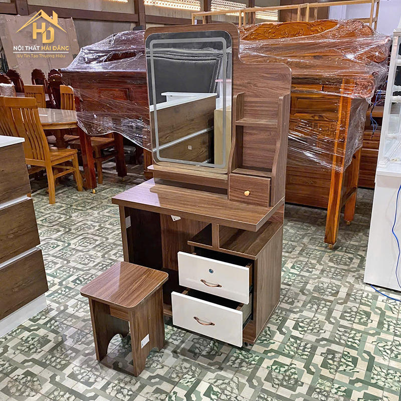 Bàn trang điểm gỗ MDF gương đèn led là mẫu bàn phù hợp cho phòng ngủ gia đình, căn hộ hoặc phòng trọ cần nội thất gọn gàng và tiện dụng. Thiết kế tích hợp gương vuông giúp soi rõ khuôn mặt khi trang điểm hoặc chăm sóc cá nhân hằng ngày. Phần mặt bàn rộng vừa phải, dễ bố trí mỹ phẩm, đồ dùng cá nhân và phụ kiện nhỏ. Bàn được chia nhiều ngăn, có hộc kéo tiện lợi giúp sắp xếp đồ đạc ngăn nắp, tránh bừa bộn. Màu nâu vân gỗ kết hợp trắng tạo cảm giác hiện đại, dễ phối với nhiều phong cách nội thất phòng ngủ khác nhau. Chất liệu MDF phủ melamine giúp bề mặt dễ lau chùi và sử dụng ổn định lâu dài.