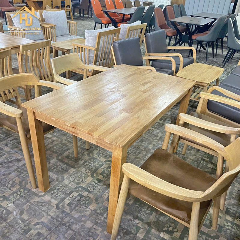 Bộ bàn ăn chữ nhật gỗ 4 ghế tự nhiên là lựa chọn phù hợp cho phòng ăn gia đình hoặc không gian kinh doanh nhỏ. Bàn có thiết kế mặt rộng, cạnh vuông vắn, bề mặt gỗ nhẵn và dễ lau chùi trong quá trình sử dụng hằng ngày. Ghế đi kèm có tay vịn cong nhẹ, lưng tựa ôm lưng tạo cảm giác thoải mái khi ngồi lâu. Phần nệm bọc da êm ái, hạn chế bám bẩn và dễ vệ sinh. Khung bàn và ghế làm từ gỗ tự nhiên chắc chắn, chịu lực tốt, đảm bảo độ ổn định khi sử dụng lâu dài. Tông màu gỗ sáng giúp không gian phòng ăn trở nên ấm cúng và dễ bài trí.