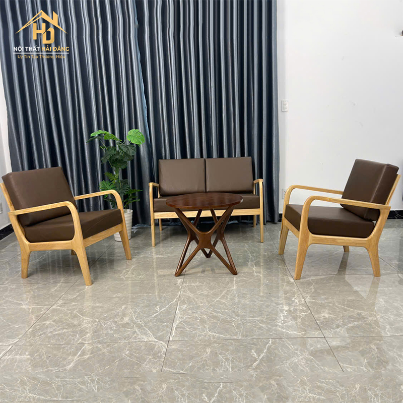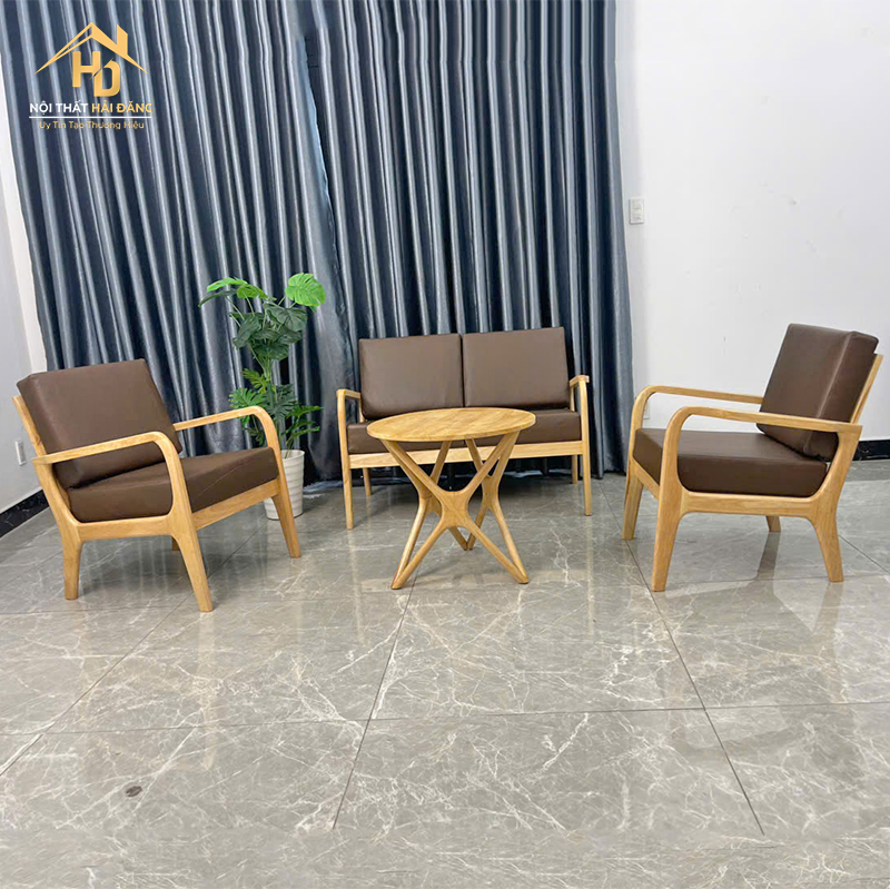 Bộ bàn ghế cafe gỗ bọc da nâu mang đến cảm giác ấm áp và sang trọng cho không gian sử dụng. Khung ghế làm từ gỗ tự nhiên chắc chắn, chịu lực tốt, bề mặt xử lý mịn giúp dễ lau chùi trong quá trình sử dụng. Phần nệm bọc da màu nâu dày dặn, ngồi êm và không bị xẹp lún nhanh, phù hợp cho việc tiếp khách lâu. Thiết kế gồm ghế đơn, ghế băng và bàn trà nhỏ gọn giúp sắp xếp linh hoạt trong quán cafe, phòng khách hoặc khu vực tiếp khách văn phòng. Sản phẩm vừa đảm bảo công năng sử dụng, vừa tăng tính thẩm mỹ cho không gian.