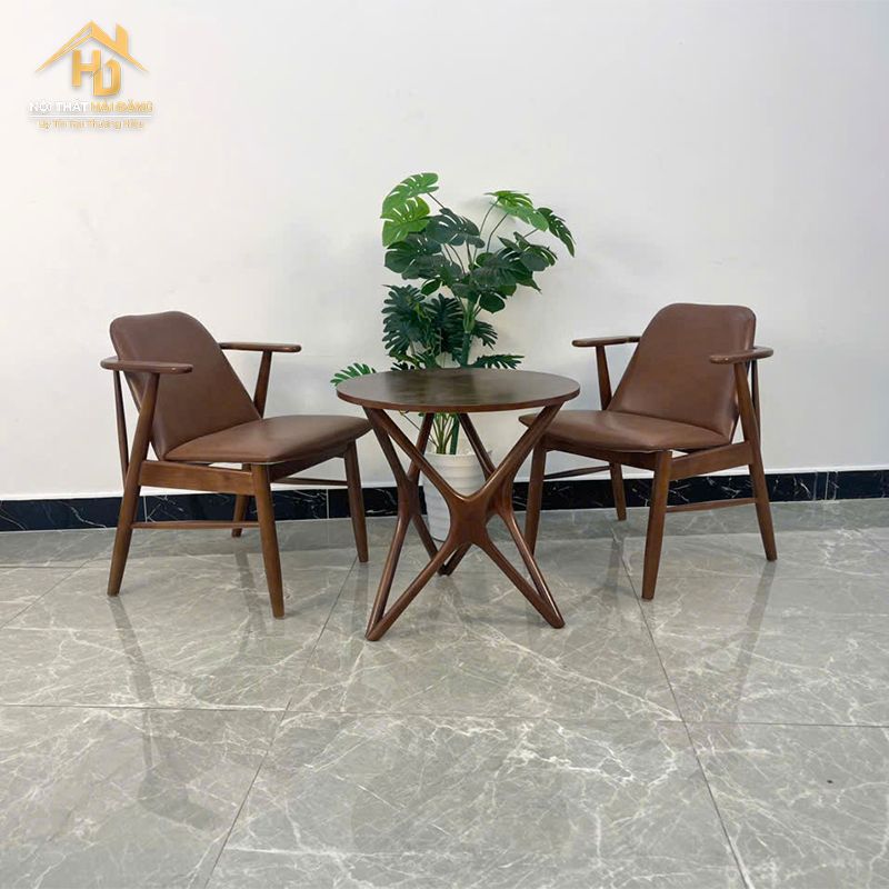 Bộ bàn ghế cafe victory mang thiết kế hiện đại với tông màu sang trọng, phù hợp nhiều không gian như quán cafe, nhà hàng, khách sạn hoặc phòng tiếp khách gia đình. Ghế được bọc da simili cao cấp, ngồi êm và dễ vệ sinh, hạn chế bám bụi và chống thấm tốt. Khung ghế bằng gỗ tự nhiên chắc chắn, chịu lực tốt và tạo cảm giác an toàn khi sử dụng. Bàn tròn gỗ chân xoắn tạo điểm nhấn tinh tế, giúp tổng thể bộ sản phẩm trở nên thu hút và chuyên nghiệp hơn. Sự kết hợp giữa da và khung gỗ mang lại vẻ ấm áp, phù hợp nhiều phong cách trang trí nội thất.