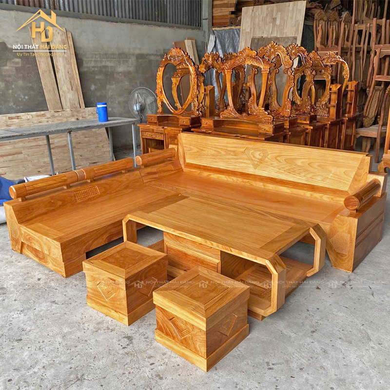 Bộ salon gỗ góc gõ đỏ chạm kim cương là sự kết hợp hoàn hảo giữa sự bền vững và tính thẩm mỹ cao. Sản phẩm được làm từ gỗ gõ đỏ tự nhiên với các chi tiết chạm khắc kim cương tinh tế, tạo nên một bộ ghế không chỉ vững chãi mà còn có giá trị thẩm mỹ cao. Bộ gồm băng ghế góc rộng rãi, ghế đơn và bàn trà tiện dụng, đi kèm với đôn nhỏ, rất phù hợp cho không gian phòng khách tân cổ điển. Màu sắc cánh ván gỗ tự nhiên mang lại vẻ đẹp sang trọng, cùng với đường vân gỗ tự nhiên đẹp mắt.