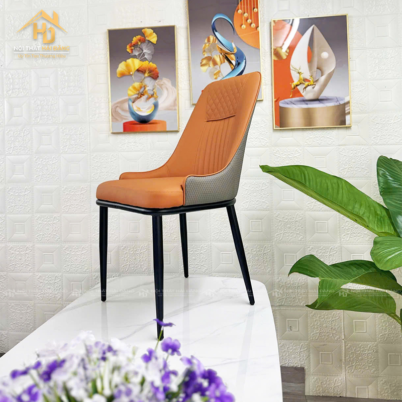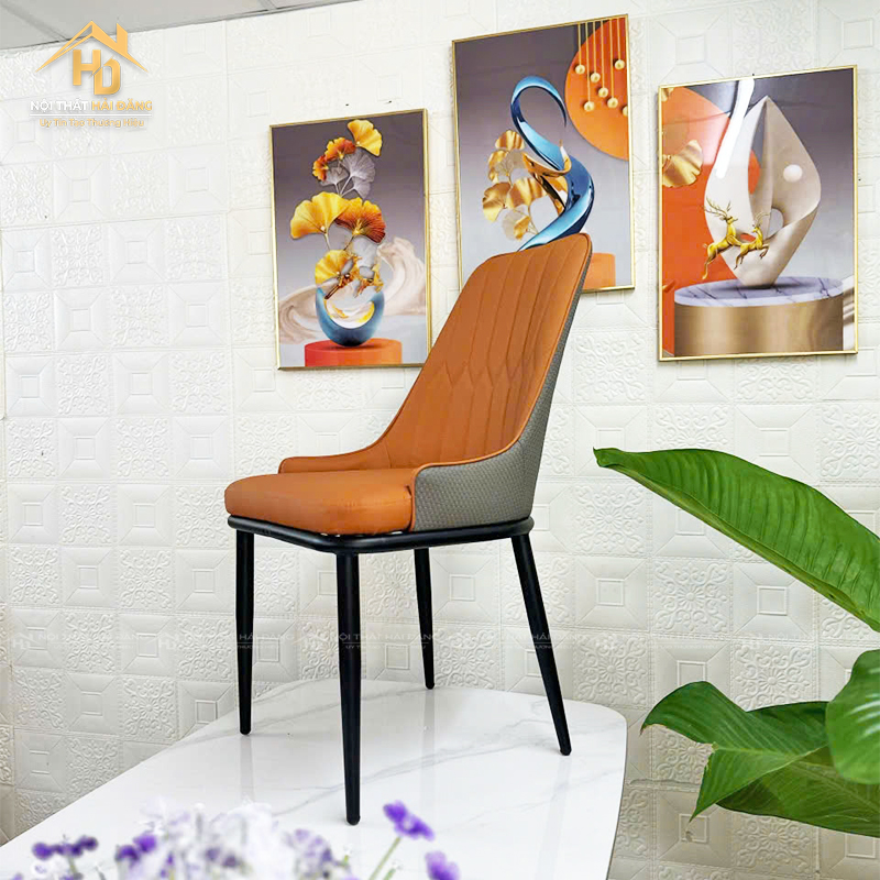 Ghế ăn bọc da cao cấp với thiết kế hiện đại và sang trọng, màu cam nổi bật giúp tạo điểm nhấn cho không gian ăn uống của bạn. Chất liệu da cao cấp, bền bỉ, kết hợp với chân kim loại chắc chắn mang đến sự thoải mái và phong cách cho phòng ăn. Đây là lựa chọn hoàn hảo cho những không gian hiện đại và thanh lịch.