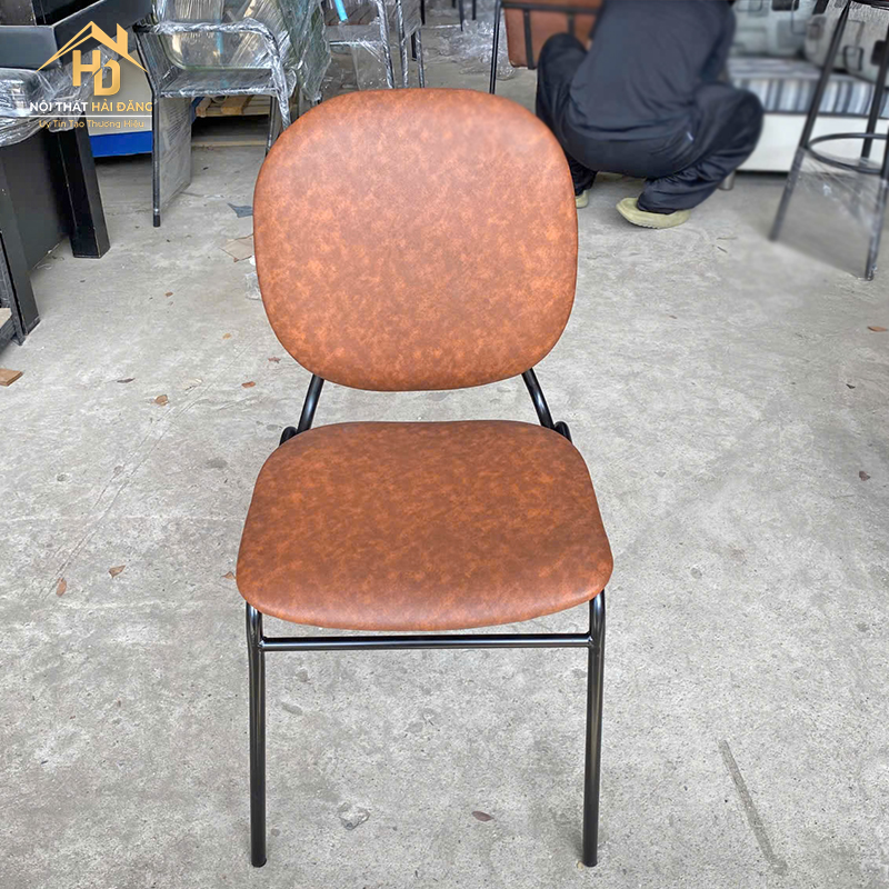 Mẫu ghế cafe bọc da nâu khung sắt mang kiểu dáng đơn giản, phù hợp sử dụng cho quán cafe, quán ăn, trà sữa hoặc khu vực tiếp khách. Phần lưng tựa và mặt ngồi được bọc nệm liền, tạo cảm giác ngồi êm và thoải mái khi sử dụng trong thời gian dài. Chất liệu da dễ lau chùi, hạn chế bám bẩn và giữ màu ổn định trong quá trình sử dụng. Khung ghế sắt chắc chắn, chịu lực tốt, giúp ghế đứng vững và hạn chế rung lắc. Tông màu nâu dễ phối với nhiều kiểu bàn và không gian khác nhau, thuận tiện khi bố trí số lượng lớn.