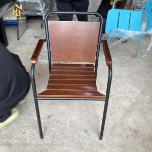 Mẫu ghế cafe gỗ nan khung sắt mang phong cách mạnh mẽ, phù hợp cho quán cafe, quán ăn, không gian sân vườn có mái che hoặc khu vực tiếp khách. Phần mặt ngồi sử dụng nan gỗ tự nhiên, tạo độ thoáng và giúp ngồi lâu không bị bí. Lưng ghế gỗ phẳng kết hợp tay vịn gỗ mang lại cảm giác chắc chắn và thoải mái khi sử dụng. Khung ghế sắt sơn đen chịu lực tốt, hạn chế rung lắc và phù hợp cho môi trường kinh doanh sử dụng thường xuyên. Kiểu dáng gọn gàng giúp dễ bố trí số lượng lớn mà vẫn giữ không gian thông thoáng.