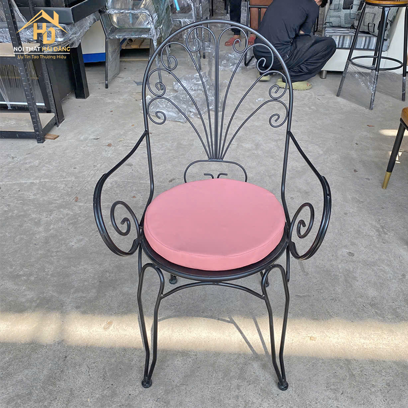 Mẫu ghế cafe sắt uốn hoa văn cổ điển, phù hợp cho quán cafe sân vườn, tiệm bánh, homestay hoặc không gian trang trí theo hướng vintage. Phần khung ghế được uốn hoa văn mềm mại, tạo điểm nhấn thẩm mỹ và cảm giác thanh thoát khi bài trí. Tay vịn cong giúp tư thế ngồi thoải mái hơn. Mặt ngồi đi kèm nệm tròn bọc simili màu hồng, độ êm vừa phải, dễ tháo rời để vệ sinh. Khung sắt sơn tĩnh điện giúp hạn chế gỉ sét, chịu lực tốt và sử dụng ổn định trong thời gian dài.