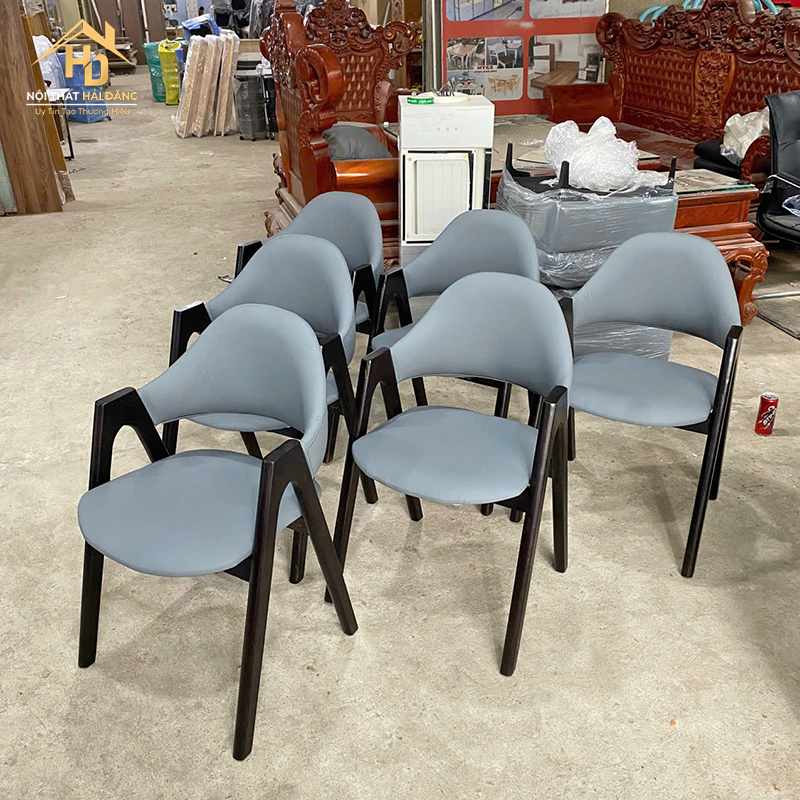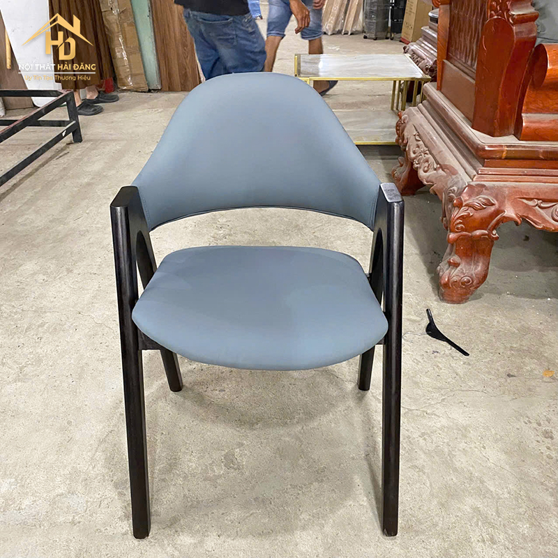 Mẫu ghế cafe bọc da màu xanh xám mang phong cách hiện đại, thích hợp dùng cho quán cafe, phòng ăn hoặc văn phòng tiếp khách. Ghế bọc da êm ái, dễ lau chùi, không thấm nước. Phần tựa lưng cong nhẹ giúp nâng đỡ cột sống, tạo cảm giác thoải mái khi ngồi lâu. Màu xám trung tính giúp dễ dàng phối hợp với các tông nội thất khác nhau, phù hợp nhiều không gian từ sang trọng đến tối giản. Đây là lựa chọn vừa bền đẹp, vừa tiết kiệm chi phí sử dụng lâu dài.
