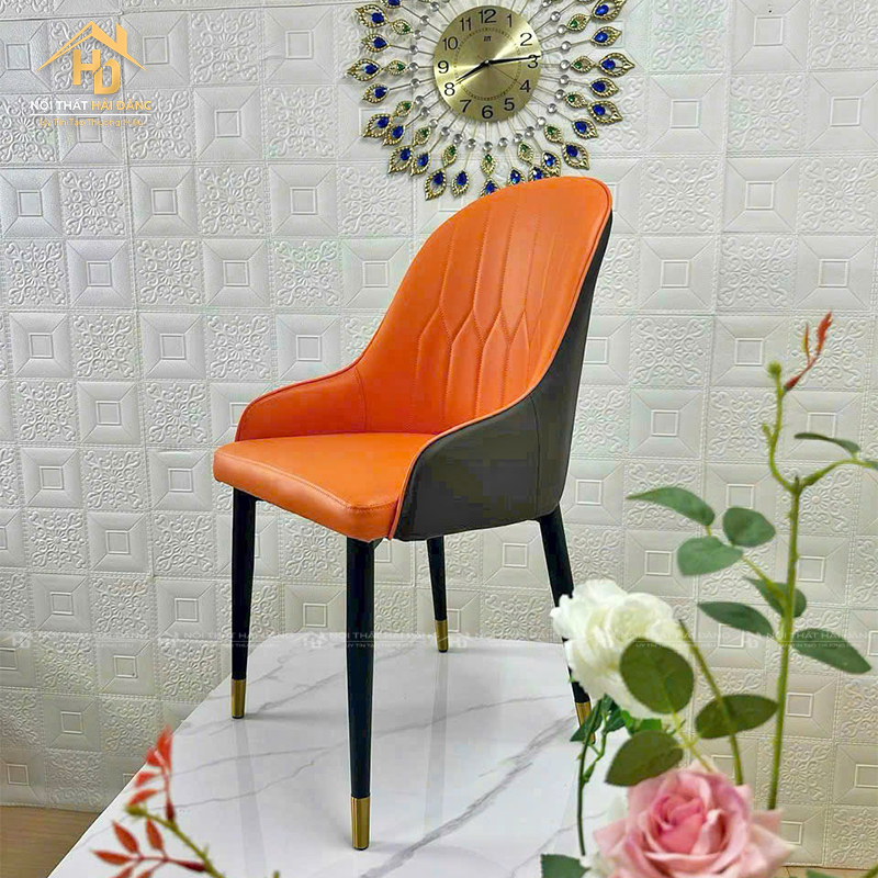 Sản phẩm là một điểm nhấn ấn tượng cho không gian phòng ăn của bạn hay quán cafe, quán ăn của bạn. Với sự kết hợp màu sắc độc đáo giữa cam rực rỡ và xám trầm ấm, chiếc ghế này mang đến vẻ đẹp vừa hiện đại vừa tinh tế. Phần lưng ghế được thiết kế uốn cong nhẹ nhàng, tạo cảm giác thoải mái và nâng đỡ tốt cho người ngồi. Chất liệu da cao cấp dễ dàng vệ sinh, bền màu theo thời gian. Chân ghế làm bằng sắt sơn tĩnh điện chắc chắn, với điểm nhấn là phần chóp mạ vàng sang trọng, góp phần nâng tầm đẳng cấp cho không gian sống.