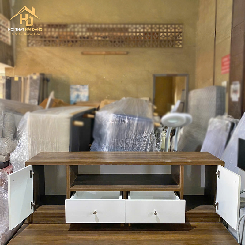 Kệ tivi gỗ phối trắng nâu được thiết kế theo dạng thấp, phù hợp đặt sát tường phòng khách hoặc phòng sinh hoạt chung. Phần mặt kệ rộng đủ để đặt tivi, loa hoặc các thiết bị điện tử đi kèm. Hai cánh tủ hai bên dùng để cất đồ ít sử dụng, trong khi hai ngăn kéo ở giữa thuận tiện cho việc lưu trữ điều khiển, giấy tờ hoặc phụ kiện nhỏ. Khoang kệ trống phía trên giúp bố trí đầu thu hoặc máy chơi game gọn gàng, dễ đi dây. Tông màu nâu kết hợp trắng tạo cảm giác hài hòa, dễ phối với sofa và các món nội thất khác trong nhà.