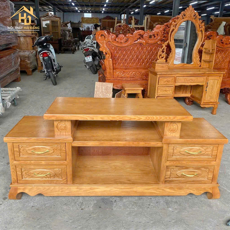 Kệ tivi gỗ sồi mang phong cách cổ điển kết hợp cùng màu gỗ tự nhiên tạo cảm giác ấm cúng và sang trọng cho phòng khách. Chất liệu gỗ sồi nổi tiếng với độ cứng cao, ít cong vênh và có tuổi thọ lâu dài nên sản phẩm bền bỉ theo thời gian. Kệ được thiết kế gồm bốn ngăn kéo giúp lưu trữ đồ dùng gọn gàng, khoang giữa rộng thích hợp đặt đầu thu hoặc loa. Mặt kệ hai tầng tạo thêm không gian để trang trí hoặc đặt tivi chắc chắn. Kiểu dáng chân uốn nhẹ nhàng giúp kệ thêm phần mềm mại và tinh tế, phù hợp với nhiều phong cách nội thất gia đình.