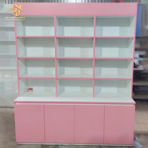 Kệ trưng bày gỗ hồng phối trắng được thiết kế theo dạng chia ô đều, giúp người bán dễ phân loại và sắp xếp sản phẩm ngay từ đầu. Các ngăn phía trên có chiều cao vừa phải, phù hợp trưng bày mỹ phẩm, phụ kiện, đồ lưu niệm hoặc sản phẩm mẫu theo từng nhóm riêng. Thiết kế không dùng kính giúp việc lấy hàng nhanh hơn, thuận tiện cho các shop có tần suất bán hàng cao. Phần tủ kín phía dưới dùng để cất hàng dự trữ, bao bì hoặc vật dụng cần che gọn, giúp khu vực trưng bày phía trên luôn thông thoáng. Màu hồng tạo cảm giác nhẹ nhàng, dễ thu hút khách hàng nữ và phù hợp với không gian shop trẻ trung.