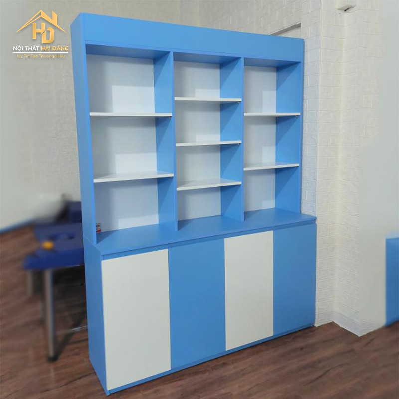 Kệ trưng bày gỗ màu xanh phối trắng được thiết kế theo dạng chia ô rõ ràng, giúp việc sắp xếp sản phẩm trở nên khoa học và dễ quan sát hơn. Các tầng kệ phía trên phù hợp trưng bày mỹ phẩm, hàng tiêu dùng, phụ kiện hoặc sản phẩm mẫu theo từng nhóm riêng. Phần kệ có độ cao vừa phải, thuận tiện cho cả trưng bày lẫn thao tác lấy hàng trong quá trình bán. Tủ kín phía dưới dùng để cất giữ hàng dự trữ, vật dụng bán hàng hoặc giấy tờ, giúp khu vực trưng bày luôn gọn gàng. Tông xanh dương tạo cảm giác mát mắt, sạch sẽ, phù hợp với cửa hàng cần sự rõ ràng và dễ nhận diện thương hiệu.