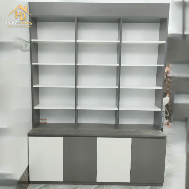 Kệ trưng bày mỹ phẩm xám phối trắng được thiết kế theo hướng đơn giản, dễ sử dụng và phù hợp với nhiều phong cách cửa hàng khác nhau. Phần kệ mở phía trên chia thành nhiều tầng, thuận tiện sắp xếp chai lọ, hộp mỹ phẩm hoặc sản phẩm chăm sóc da theo từng dòng riêng biệt. Khoảng cách giữa các tầng vừa phải, giúp trưng bày sản phẩm gọn gàng mà vẫn dễ quan sát. Phần tủ kín phía dưới dùng để cất hàng dự trữ, vật tư bán hàng hoặc đồ dùng cá nhân, giúp khu vực trưng bày phía trên luôn ngăn nắp. Tông màu xám phối trắng tạo cảm giác sạch sẽ, hiện đại, phù hợp cho shop mỹ phẩm, spa hoặc cửa hàng chăm sóc sắc đẹp.