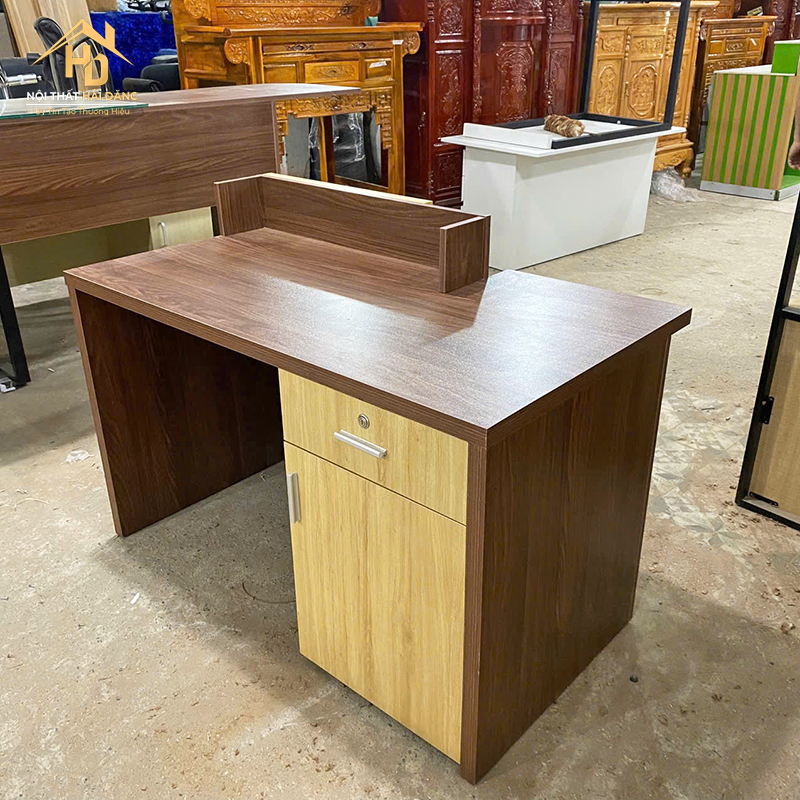 Quầy lễ tân gỗ mdf phối màu được thiết kế với kiểu dáng hiện đại, giúp tạo điểm nhấn cho không gian văn phòng làm việc. Với chất liệu gỗ MDF phủ Melamine, quầy lễ tân này không chỉ bền chắc mà còn dễ dàng vệ sinh, giúp không gian luôn sạch sẽ và gọn gàng. Quầy có các ngăn kéo và kệ lưu trữ rộng rãi, phù hợp để chứa tài liệu và các vật dụng cần thiết. Đây là lựa chọn lý tưởng cho các văn phòng, công ty hay các không gian tiếp khách.