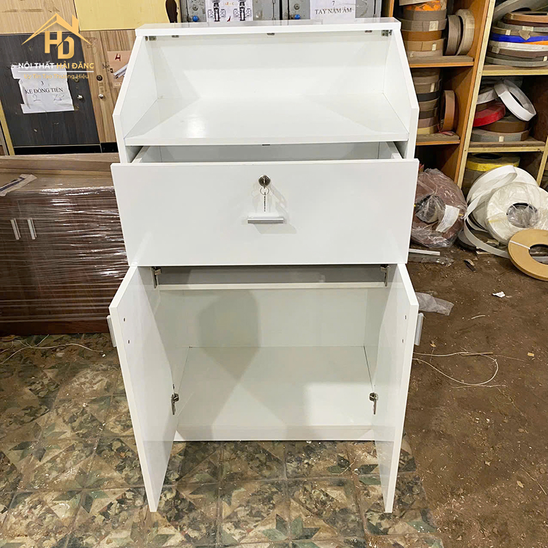 Quầy lễ tân mini gỗ MDF là lựa chọn lý tưởng cho các không gian nhỏ như spa, salon, shop quần áo hoặc văn phòng nhỏ. Thiết kế nhỏ gọn giúp tiết kiệm diện tích nhưng vẫn đảm bảo công năng đầy đủ với ngăn kéo có khóa bảo mật và tủ dưới 2 cánh rộng rãi. Bề mặt phủ sơn trắng bóng mang lại cảm giác sang trọng, dễ lau chùi và giữ sạch lâu. Kiểu dáng vuông vắn, hiện đại, phù hợp nhiều phong cách nội thất, giúp tạo điểm nhấn chuyên nghiệp ngay từ khu vực đón tiếp khách hàng.