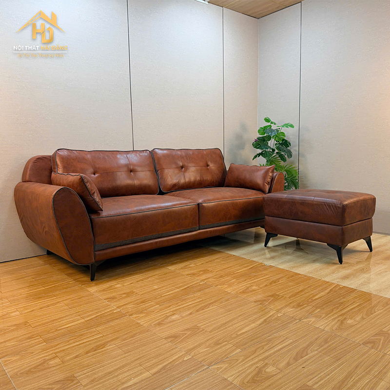 Sofa da góc L phong cách Retro là lựa chọn phù hợp cho phòng khách cần sự gọn gàng và tiện nghi. Thiết kế dạng góc giúp tận dụng tốt không gian, phù hợp với nhiều kiểu bố trí khác nhau. Phần nệm ngồi êm, độ đàn hồi ổn định mang lại cảm giác thoải mái khi sử dụng hằng ngày. Chất liệu da giúp dễ lau chùi, hạn chế bám bẩn trong quá trình sử dụng. Sản phẩm đi kèm đôn rời tiện lợi, có thể dùng để gác chân hoặc làm chỗ ngồi thêm khi cần.