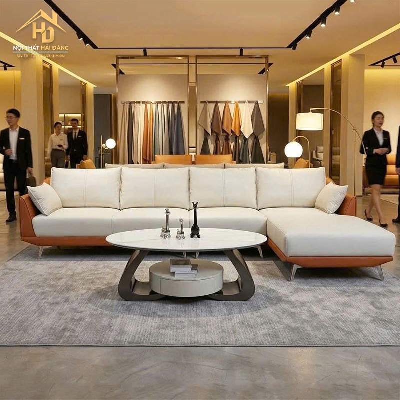 Sofa Góc L Màu Trắng Kem Phối Cam Hiện Đại
