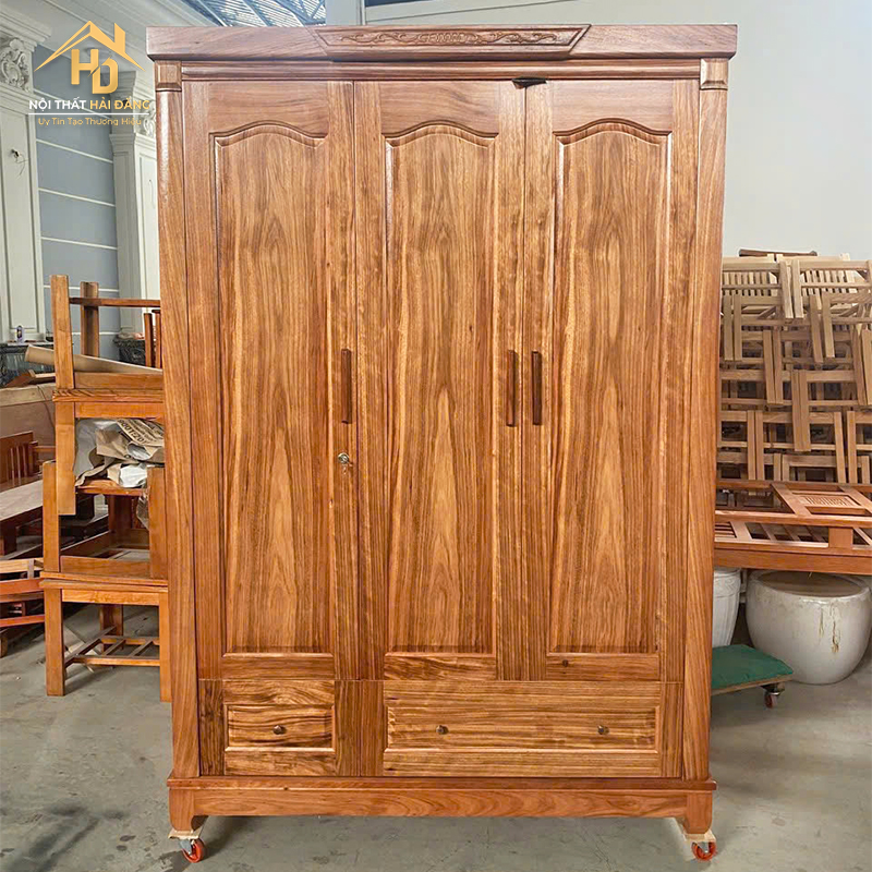Tủ áo 3 cánh phủ hương đá này được làm từ gỗ hương đá tự nhiên cao cấp, mang lại vẻ sang trọng và bền bỉ. Thiết kế 3 cánh mở kết hợp với 2 ngăn kéo dưới giúp bạn dễ dàng sắp xếp quần áo và vật dụng một cách gọn gàng. Bề mặt gỗ bóng loáng và màu nâu tự nhiên tinh tế, tạo điểm nhấn cho không gian phòng ngủ. Sản phẩm phù hợp cho gia đình muốn kết hợp thẩm mỹ và tính tiện dụng, đảm bảo sử dụng lâu dài và giữ được vẻ đẹp tự nhiên của gỗ hương đá.