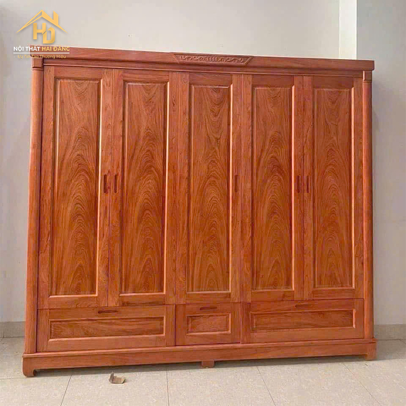 Tủ áo 5 cánh phủ hương đá này được chế tác từ gỗ hương đá cao cấp, mang lại vẻ đẹp sang trọng và bền bỉ. Thiết kế 5 cánh mở kết hợp với ngăn kéo dưới giúp bạn sắp xếp quần áo và vật dụng gọn gàng, tiện lợi. Bề mặt gỗ bóng loáng và màu nâu tự nhiên tinh tế, dễ dàng kết hợp với các nội thất khác trong phòng ngủ. Sản phẩm không chỉ bền chắc mà còn tạo điểm nhấn sang trọng, mang đến không gian phòng ngủ ấm cúng và tiện nghi.