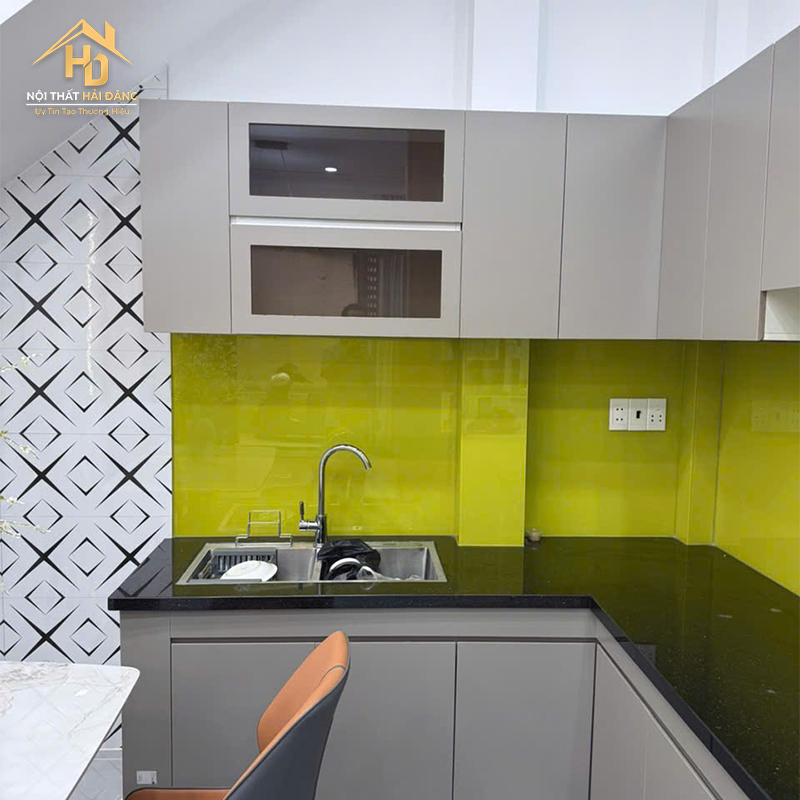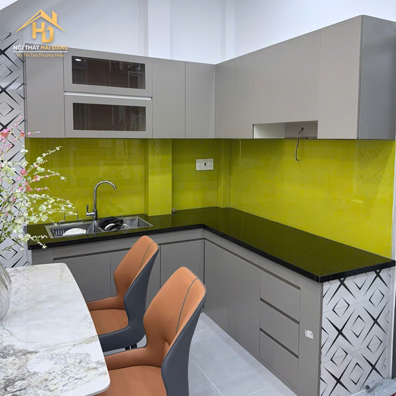 | Tên sản phẩm | Tủ Bếp Chữ L Màu Xám Phối Kính Ốp Bếp |
