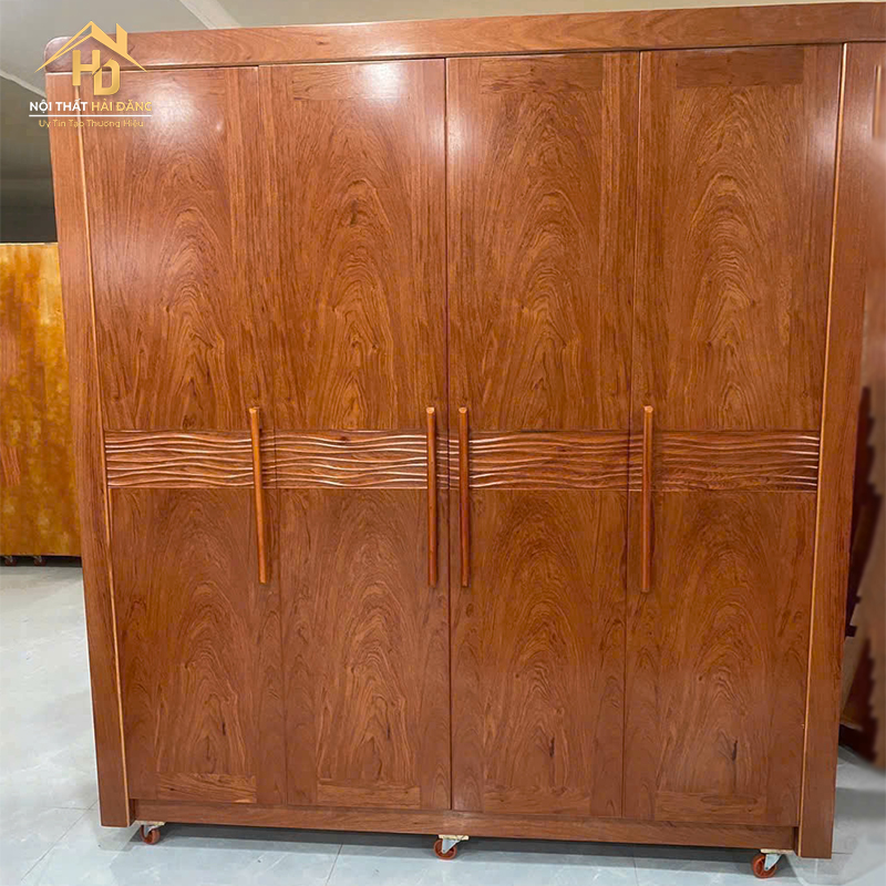 Tủ quần áo gỗ tự nhiên 4 cánh thiết kế đơn giản nhưng vô cùng tinh tế, phù hợp với không gian phòng ngủ rộng rãi. Tủ có tay nắm dọc dài giúp dễ dàng đóng mở, cùng họa tiết vân gỗ và các đường chạm nhẹ tạo điểm nhấn tinh tế. Phía dưới có bánh xe giúp di chuyển nhẹ nhàng mà không cần tốn sức. Bên trong được chia thành nhiều khoang, giúp bạn thoải mái sắp xếp quần áo, chăn ga hay vật dụng cá nhân. Gỗ tự nhiên chắc chắn, bền đẹp theo thời gian.
