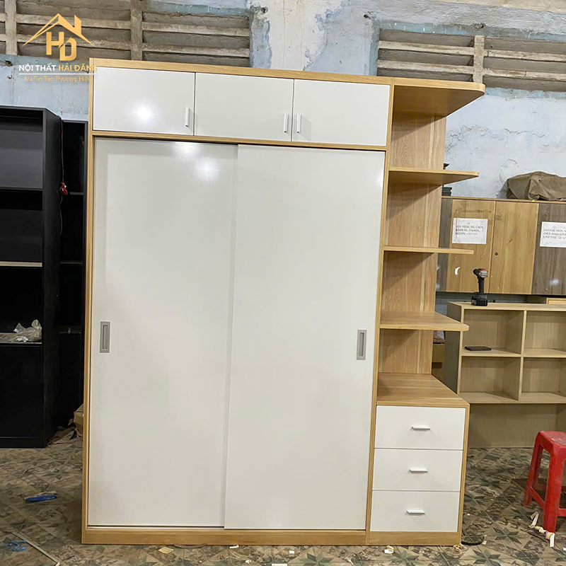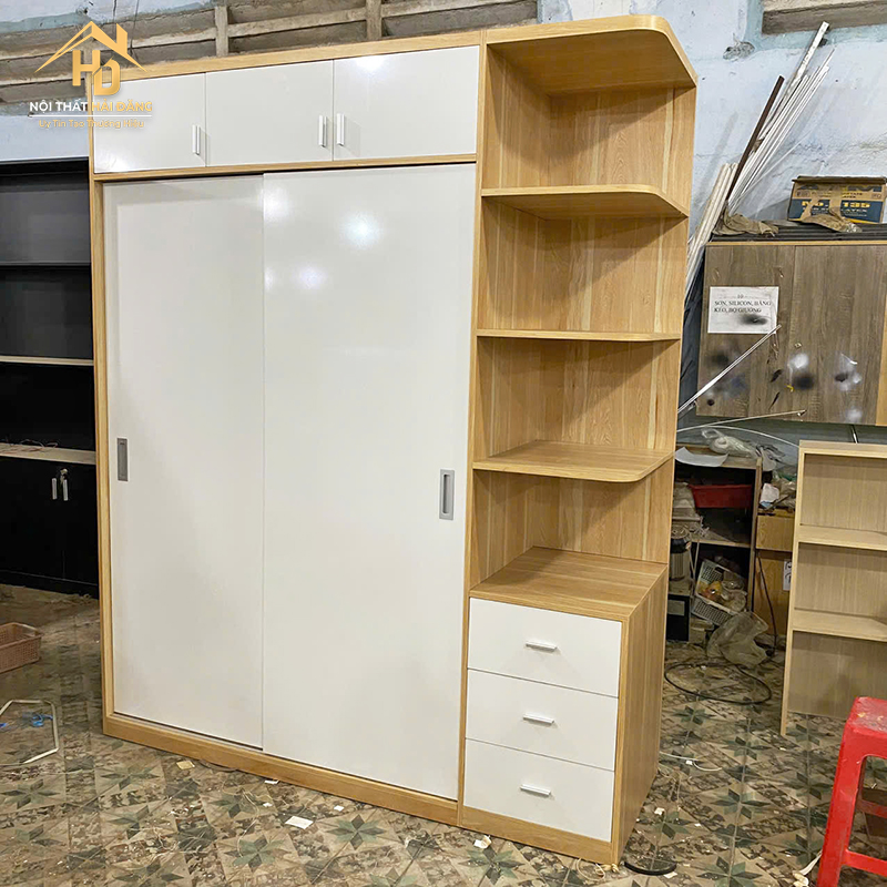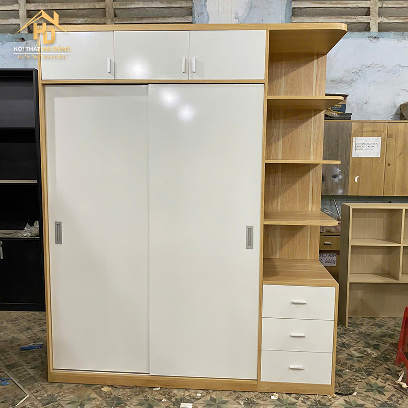 Tủ quần áo cửa lùa kèm kệ là lựa chọn thông minh cho những ai muốn tận dụng tối đa diện tích phòng ngủ. Thiết kế cửa trượt giúp tiết kiệm không gian khi sử dụng, thuận tiện cho căn hộ nhỏ hoặc nhà phố. Phần kệ bên hông có thể dùng để trưng bày túi xách, sách, phụ kiện hay đồ trang trí, giúp góc phòng thêm gọn gàng và đẹp mắt. Tủ được làm từ gỗ MDF phủ Melamine, có khả năng chống ẩm, chống trầy xước, dễ vệ sinh. Tông màu trắng phối vân gỗ sáng mang lại cảm giác sang trọng, trẻ trung, phù hợp với nhiều phong cách nội thất khác nhau.