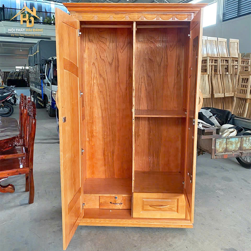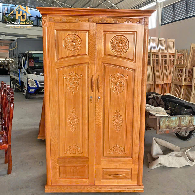 Tủ quần áo 2 cánh được làm từ gỗ tự nhiên, với phần cánh tủ chạm khắc hoa văn nổi bật theo phong cách cổ điển, mang lại sự sang trọng cho không gian phòng ngủ. Tủ được chia thành 2 khoang bên trong: một bên để treo đồ và một bên để gấp, kèm thêm hai ngăn kéo nhỏ phía dưới dùng để cất giữ vật dụng cá nhân. Màu gỗ sáng dễ phối với nhiều loại nội thất. Tay nắm gọn gàng, có khóa an toàn, sử dụng tiện lợi. Đây là mẫu tủ phù hợp cho không gian vừa và nhỏ, dễ dàng sắp xếp và sử dụng lâu dài.