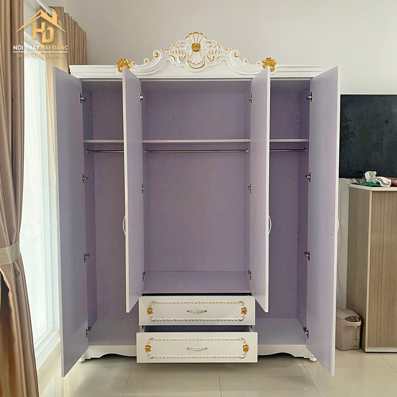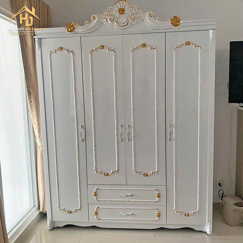 Tủ Quần Áo Gỗ 4 Cánh Màu Trắng Tân Cổ Điển