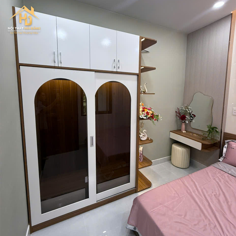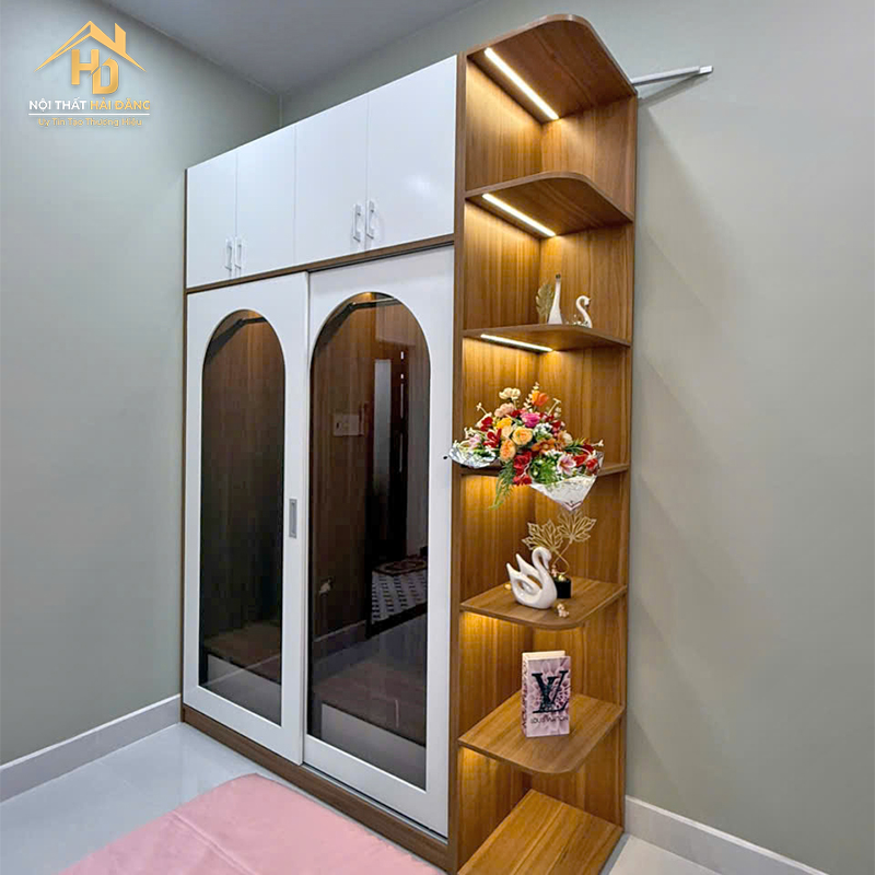 Tủ quần áo gỗ phối kính 2 cánh liền kệ là lựa chọn phù hợp cho phòng ngủ gia đình cần sự gọn gàng và tính thẩm mỹ cao. Thiết kế tủ kết hợp kệ trang trí bên hông giúp tận dụng không gian hiệu quả, vừa để quần áo vừa trưng bày đồ decor, sách hoặc phụ kiện cá nhân. Phần cánh kính giúp quan sát bên trong dễ dàng, tạo cảm giác không gian thoáng hơn. Bên trong tủ được chia khoang treo và kệ xếp đồ hợp lý, thuận tiện cho sinh hoạt hằng ngày. Màu trắng phối vân gỗ mang lại cảm giác sáng sủa, dễ phối với nhiều phong cách nội thất phòng ngủ khác nhau. Bề mặt melamine nhẵn, dễ lau chùi và sử dụng ổn định lâu dài.